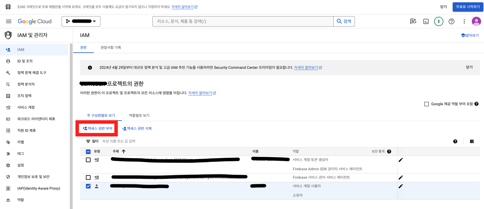 IAM - 원하는 서비스 계정 체크 후 액세스 권한 부여 클릭 후 부여(fastlane 배포 시 필수로 서비스 계정 - 서비스 계정 사용자 권한 부여해야 함)