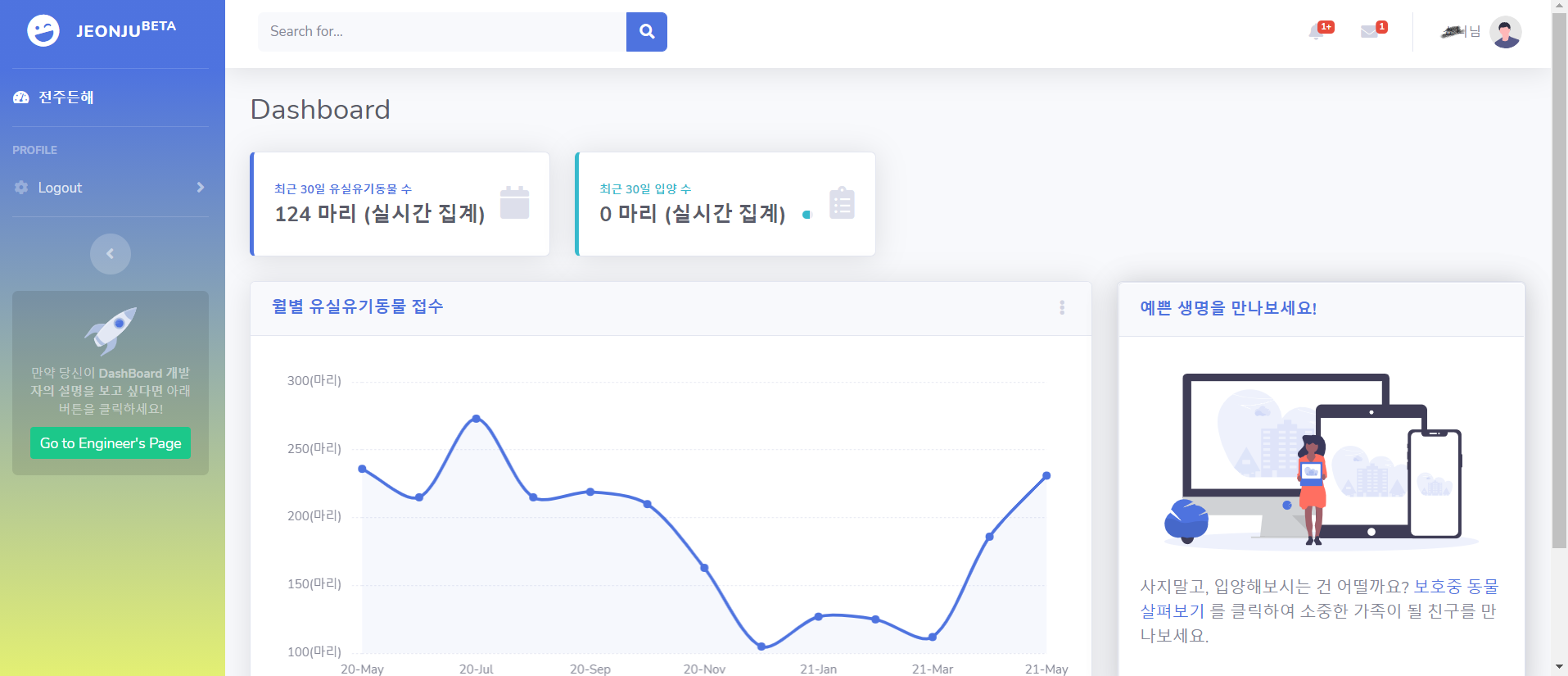 - 전주시민들에게 전주 유기동물의 실정을 실시간 대시보드를 통해 알림으로써 유실유기동물 개체수 증가와 대비한 입양률의 저조함을 확인하며, 심각함을 인지함과 동시에, 실시간으로 업데이트되는 전주시의 유실유기동물을 확인할 수 있는 링크탭을 통해 보여준다.