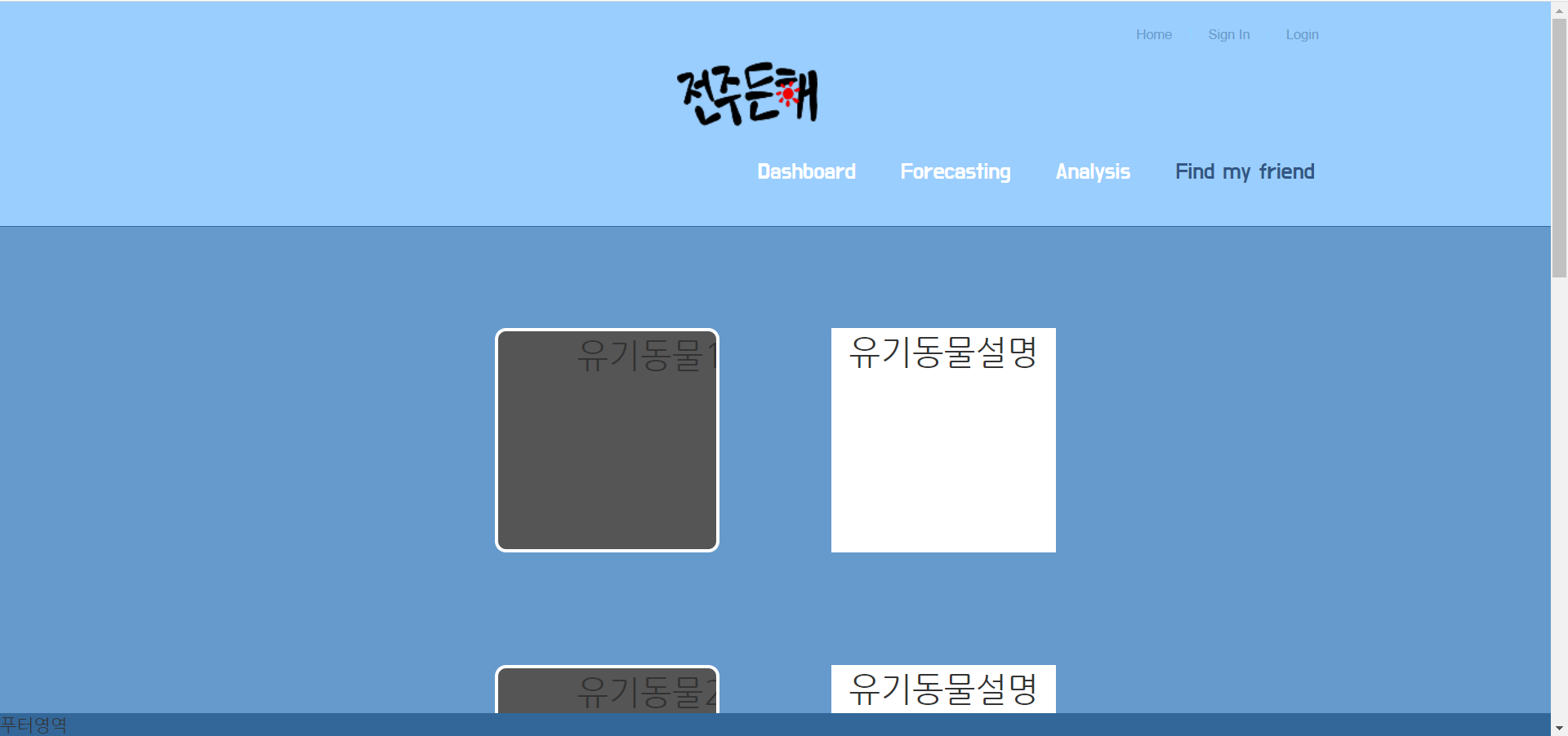 데이터 분석을 바탕으로 전주시 유기동물 빅데이터를 활용한 관리소 관련시설에겐 좀 더 손쉬운 통제를, 일반인에겐 현재 보호하고 있는 유기동물을 보여줌으로써 입양율을 높이고 나아가 전주시가 체계적인 조직을 가지고 유기동물 문제를 포함한 동물복지에 관심이 커지는 계기를 심어 줄 수 있는 전주든해 라는 이름의 전주시 온라인 동물보호소를 구현하였다.